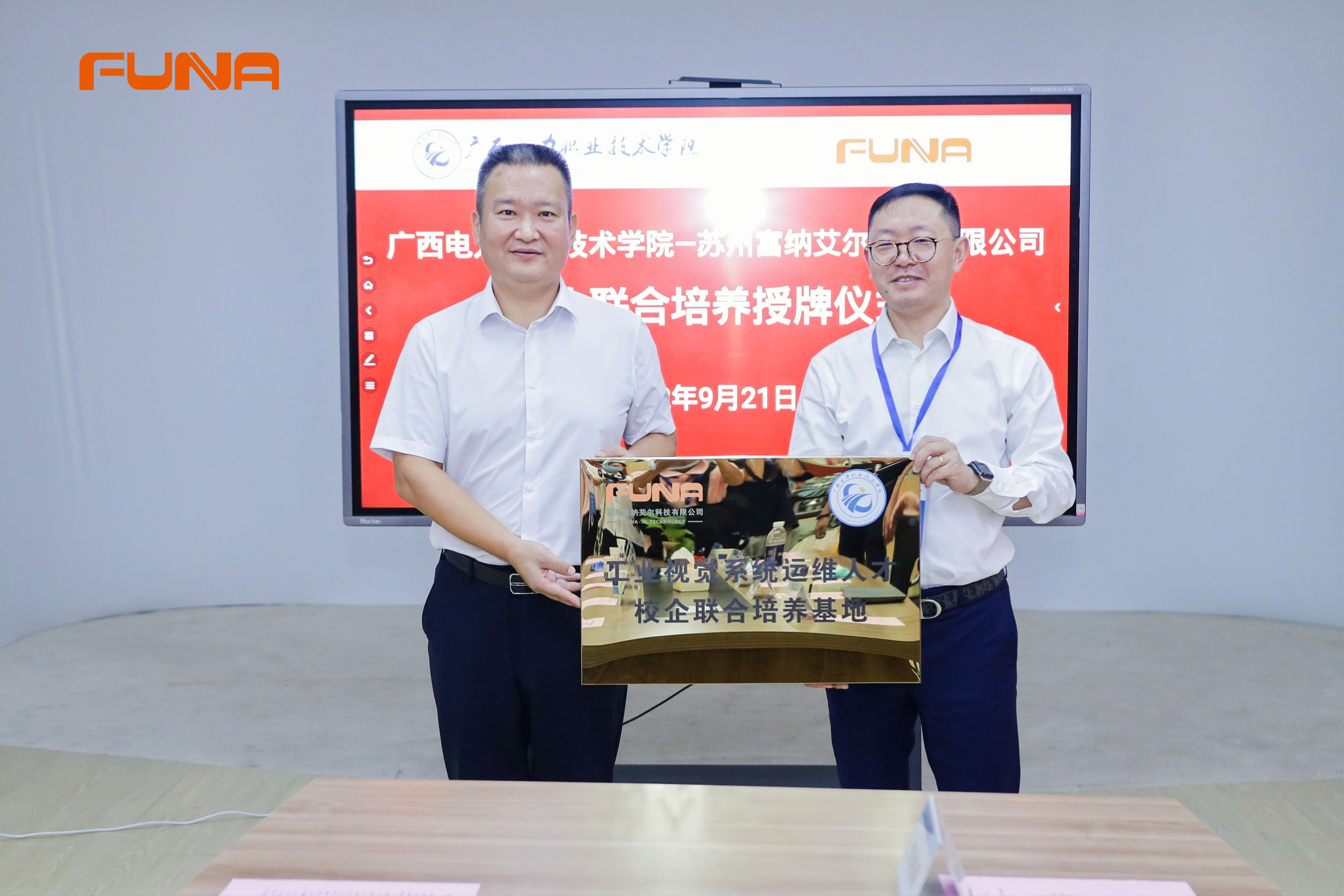 吳加富董事長向?qū)W校授“工業(yè)視覺系統(tǒng)運(yùn)維1+X考證基地”“工業(yè)視覺系統(tǒng)運(yùn)維人才校企聯(lián)合培養(yǎng)基地”校企合作牌匾。推動(dòng)學(xué)校與企業(yè)資源共享、深度融合,優(yōu)化企業(yè)人力資源,進(jìn)一步實(shí)現(xiàn)企業(yè)、學(xué)校、學(xué)生“三贏”的目標(biāo)。